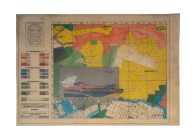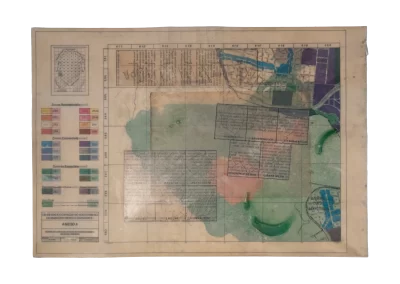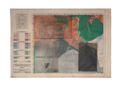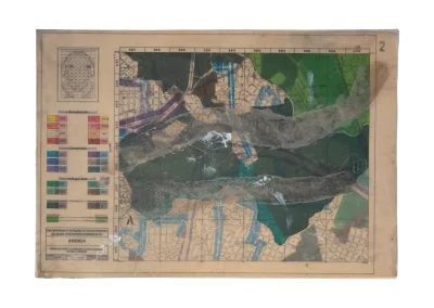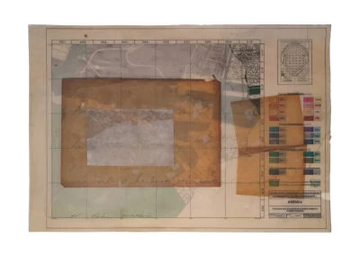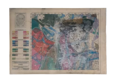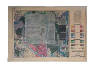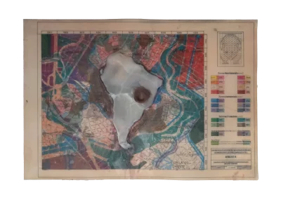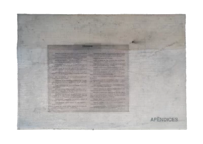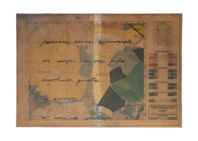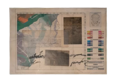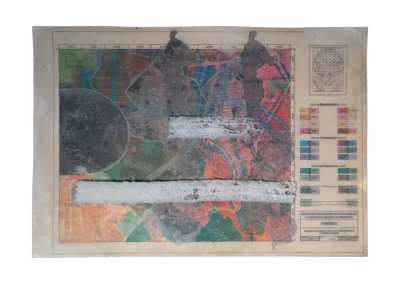 Páginas da publicação da Lei de Uso e Demarcação do Solo de Belo Horizonte (1985) são trabalhadas sofrendo alterações, colagens, incisões, inscrições, desenhos e outras faturas.