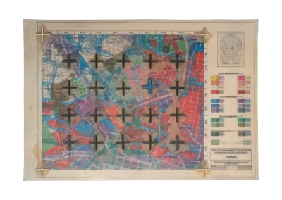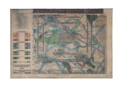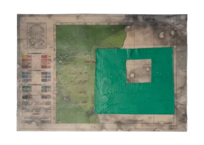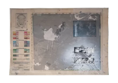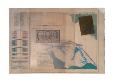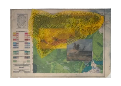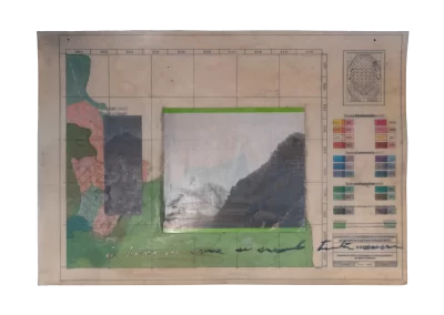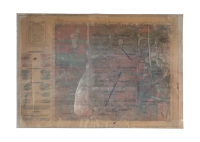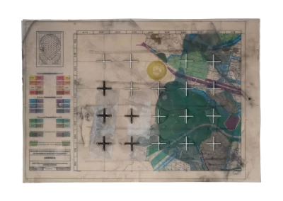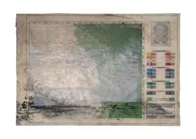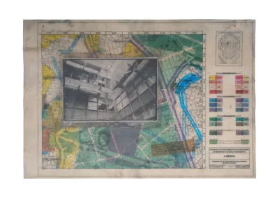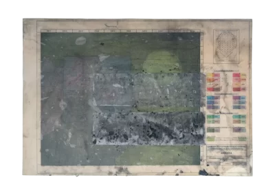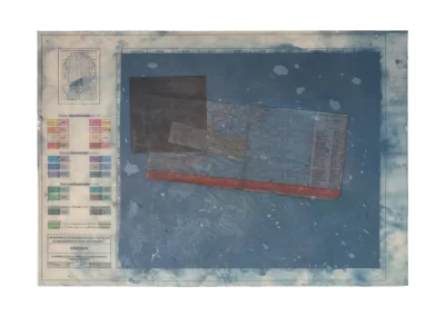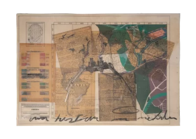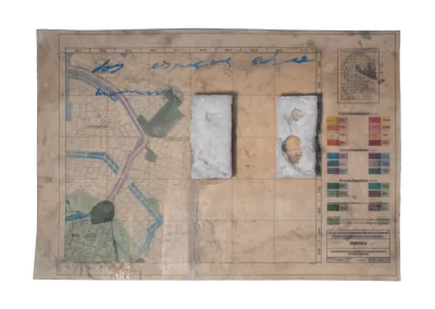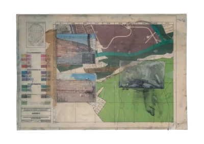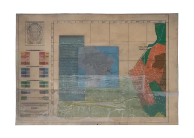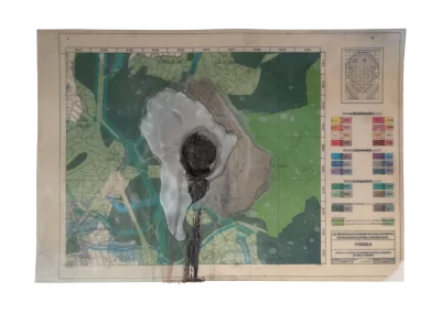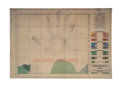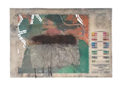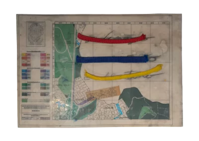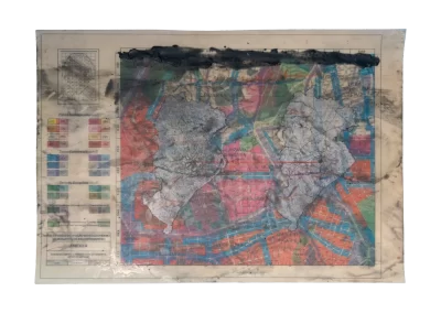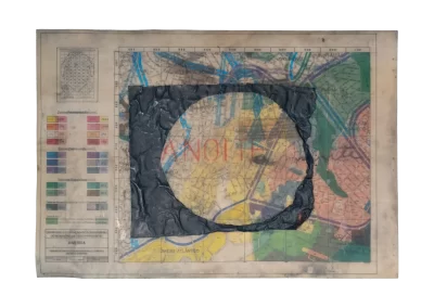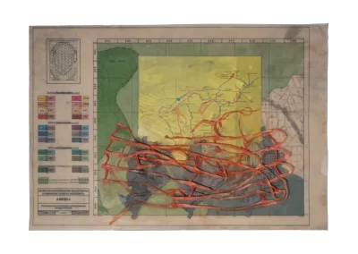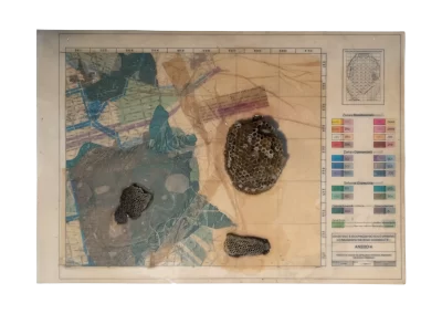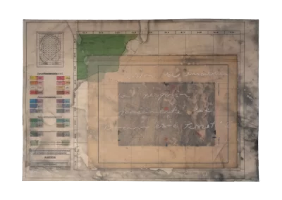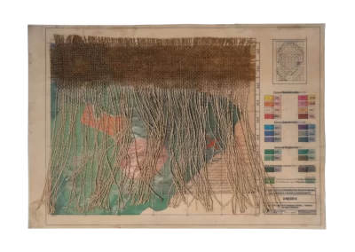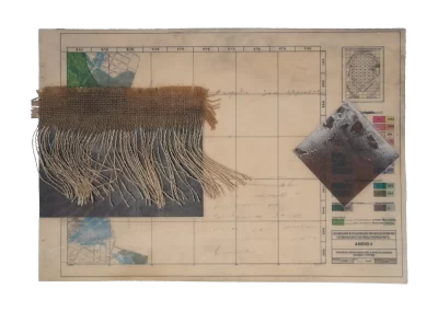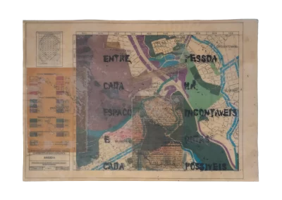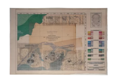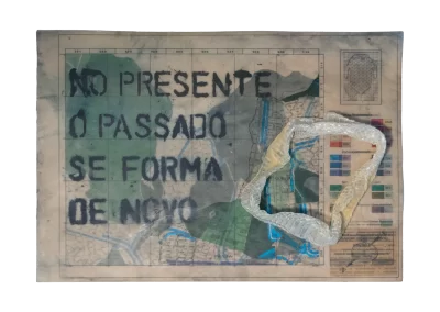 O desenho acontece como um processo de resgate histórico. O uso da parafina sela o papel, protegendo-o. Ao mesmo tempo, o papel se torna translúcido: diferentes partes dos mapas – impressos em frente e verso – se atravessam.