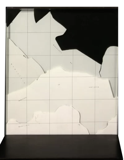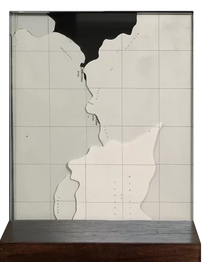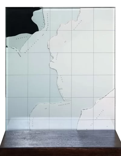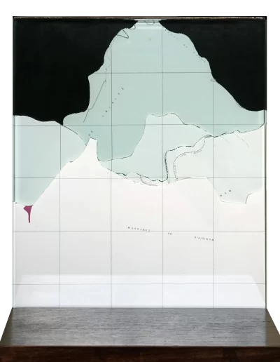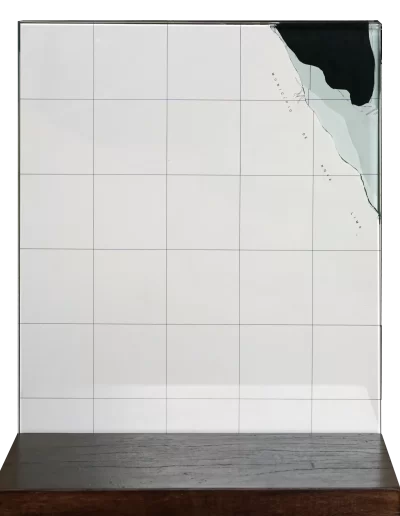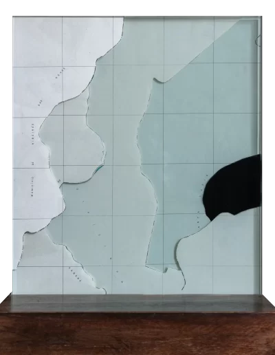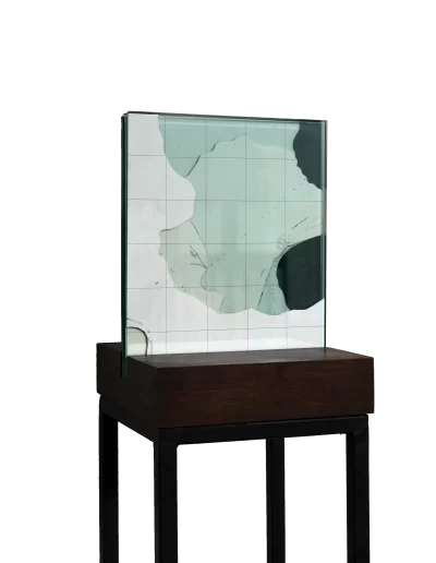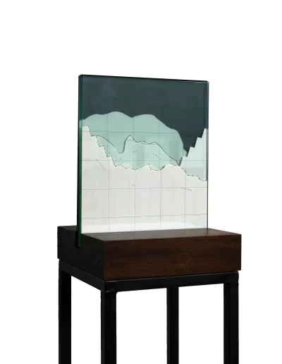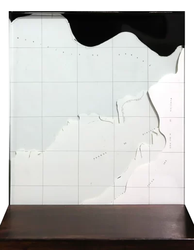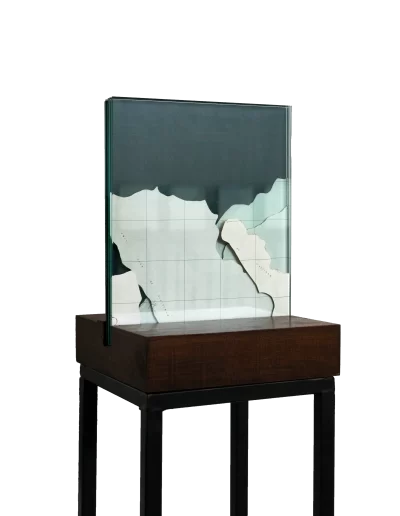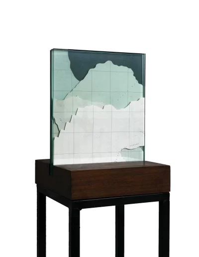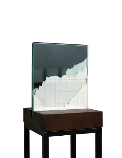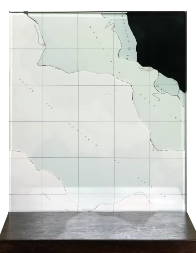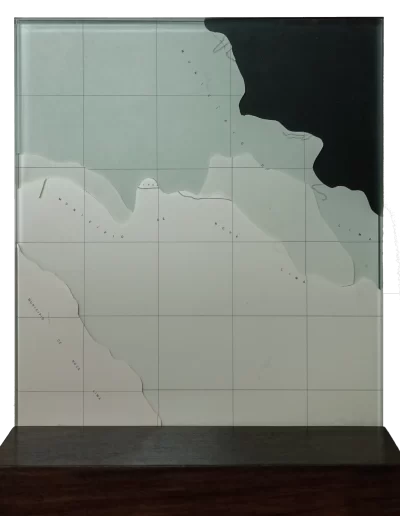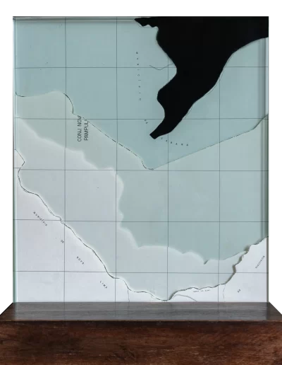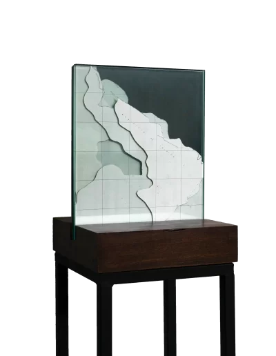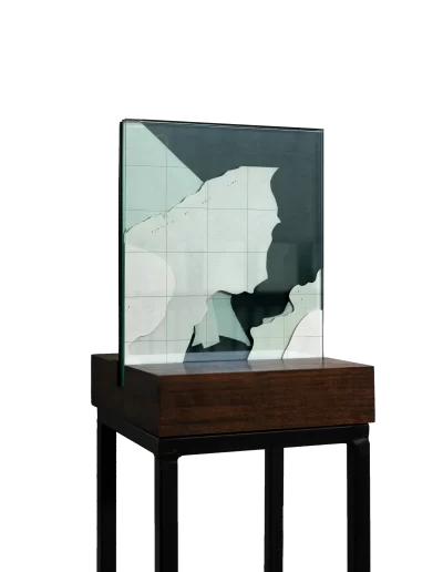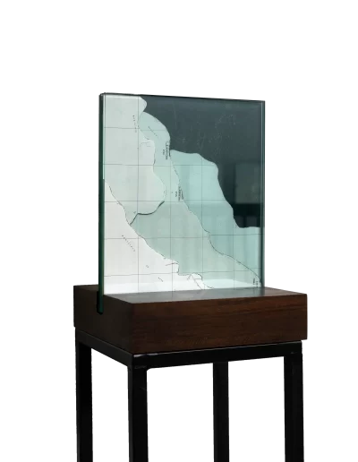 ​Uma sequência destes espaços são recortados e sobrepostos, intercalados em camadas por chapas de vidro transparente. Ao fundo das transparências e recortes, a presença de uma chapa de ferro se destaca na contra-forma. O conjunto é então preso à uma estrutura de madeira que simula a  presença de um dormente, encaixado com leveza sobre uma mesa de aço.
