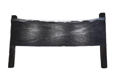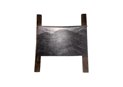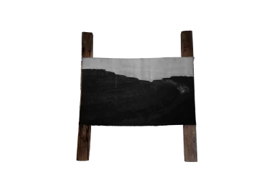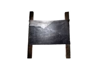 Dormentes é uma série objetos instalativos, formados por sete pinturas à carvão. Cada pintura representa paisagens desconstruídas pela ação extrativista mineral. O conjunto é então estendido como grandes bandeiras entre pares de dormentes de estrada de ferro reutilizados.