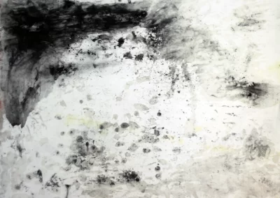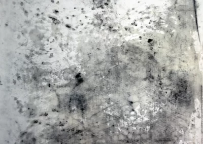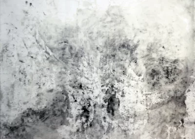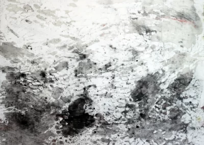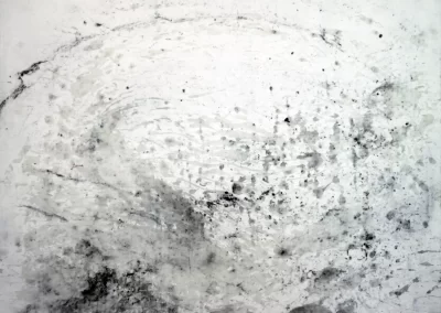 A montagem suspensa, em sanduíche acrílico, busca evidenciar uma conversa com os Objetos Gráficos, de Mira Schendel. Aqui, no entanto, as manchas tipográficas – que davam lugar à uma espécie de condição humana em meio às paisagens flutuantes de Schendel –, perdem lugar para manchas mais orgânicas que sugerem a diluição da presença humana em meio a um espaço fluido.